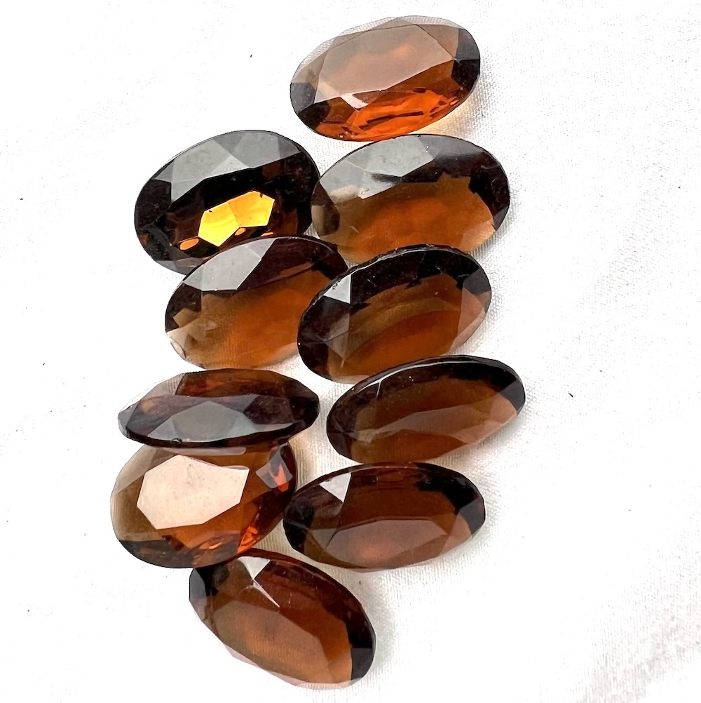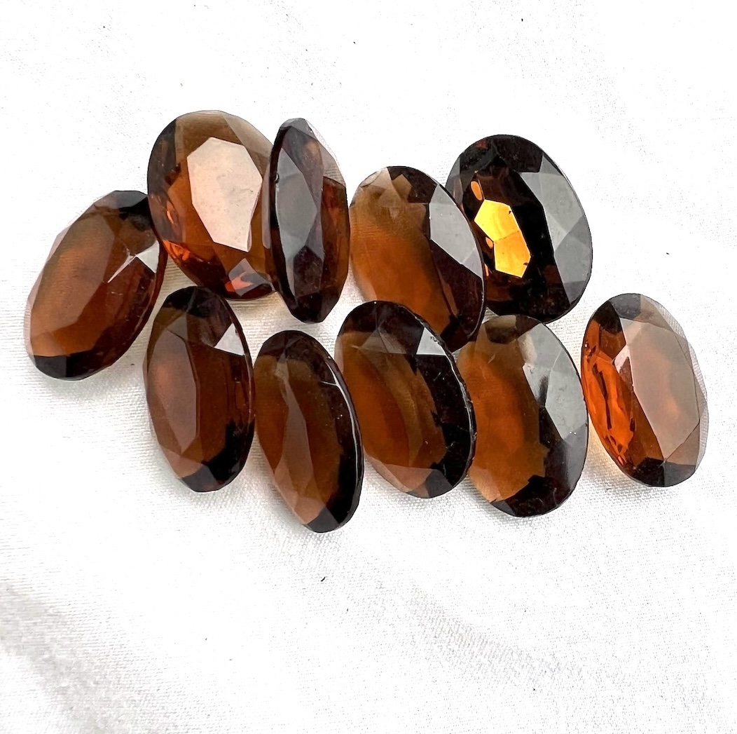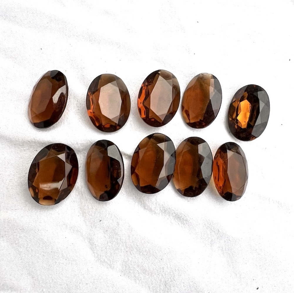 Lovely group of 10 large 25m north to south by 18m east to west by 5-6m deep brown topaz color FACETED GLASS ovals for jewelry making, pendants, furniture/lamp decoration, recycle, upcycle, restore, create, bracelets etc. These are from the 1960s, 1970s to early 1980s and were originally used in oversized jewelry. All are faceted on BOTH sides and quite sparkly. All are still in excellent condition. Part of an old jewelry manufacturer’s supply from many decades ago.