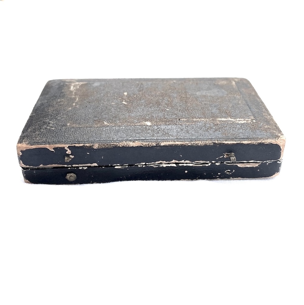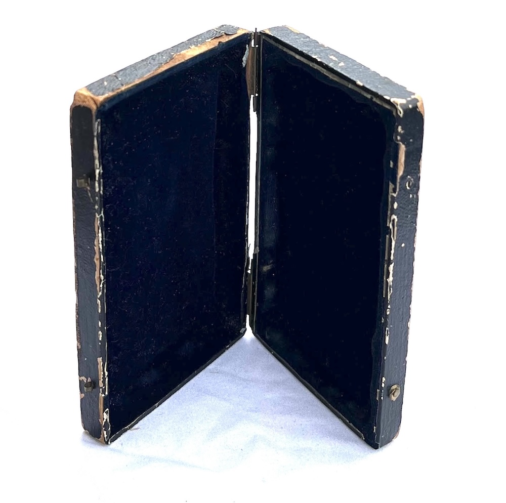 Still in its original black paper and board blue velvet case this is a rare and beautiful card case for your antique accessories collection or vanity display.