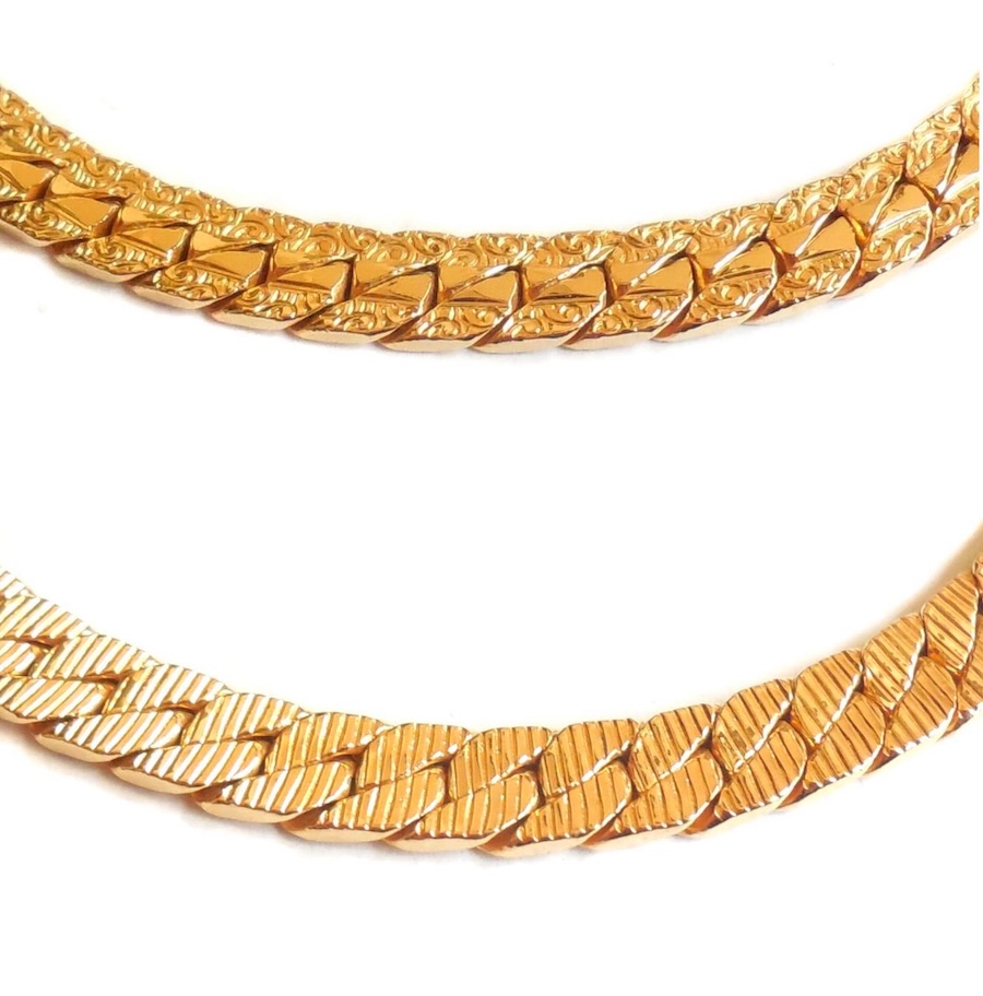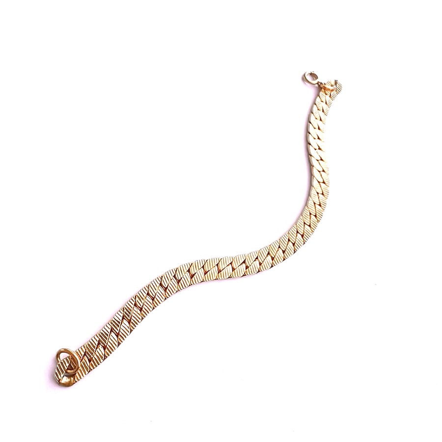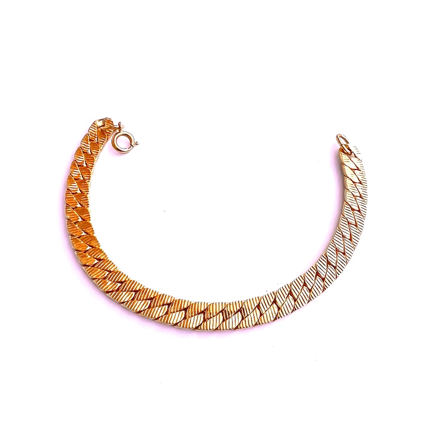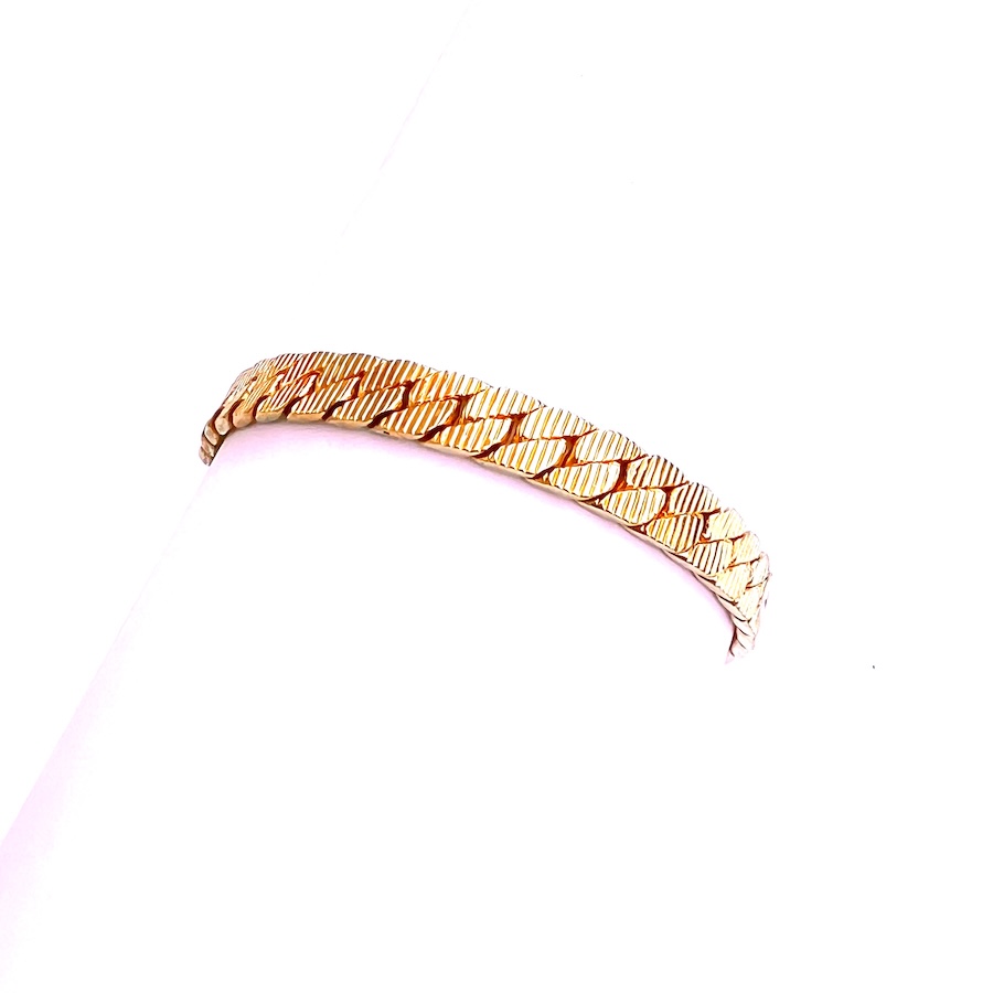 For those of you who collect well crafted vintage 1970s era gold jewelry this is a lovely heavy gold plated double sided bracelet in excellent, no wear condition. Never damaged, repaired or altered in any way. All original, all gold is still bright and shiny like new. All of the fancy repousse work on one side is very crisp, clear and clean. The opposite side has a fancy Miami Cuban link with deep recesses going across each link. It is thick, solid and durable; not flimsy. Size is 7″ long end to end and laying flat on a table with the clasp open. Should fit a size 6 1/2″ easily, possible 6 3/4″. There are oval links so additional could be added if needed. Width across the linkage is 1/4″. Thickness is over 1/16″. This is a very versatile showy bracelet in beautiful condition for day, evening, layering, special occasion or any other event you may have. Lovely addition for your vintage statement jewelry collection.