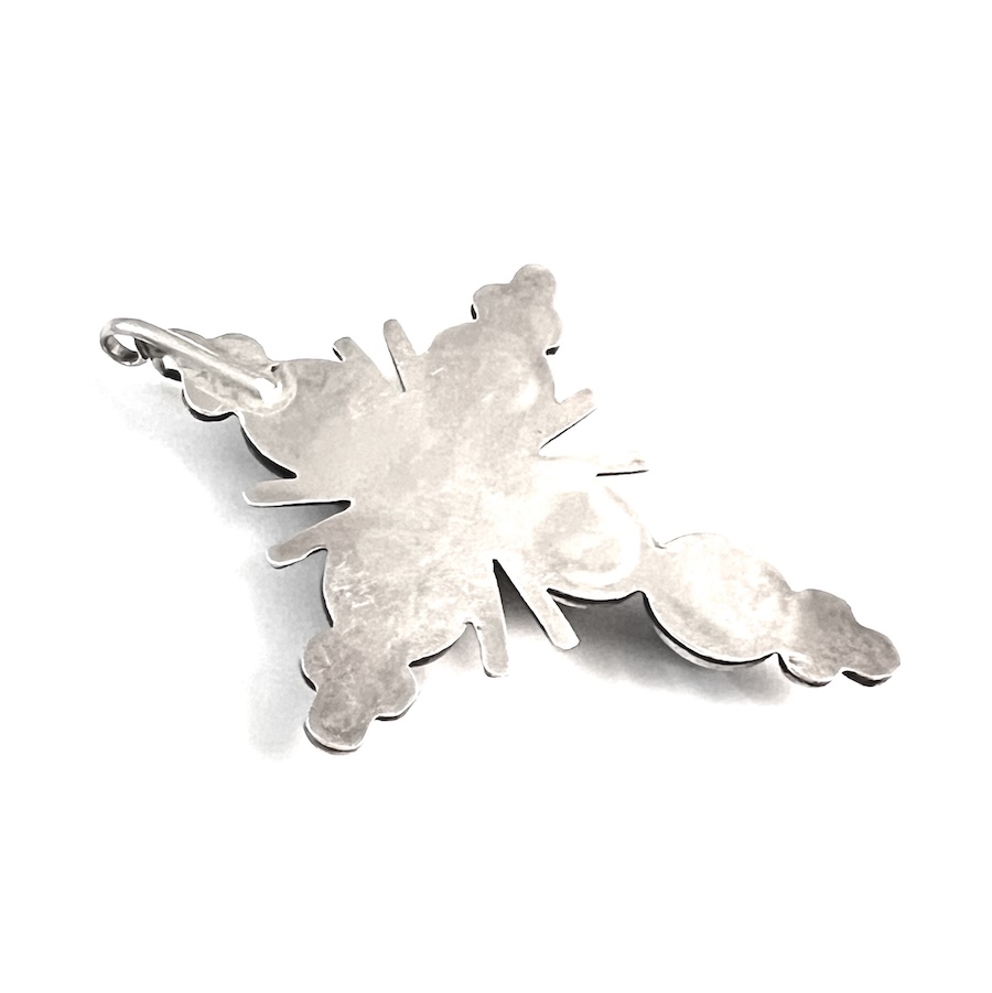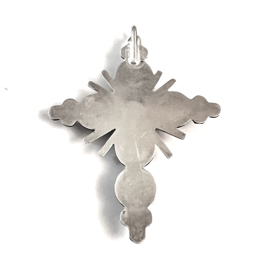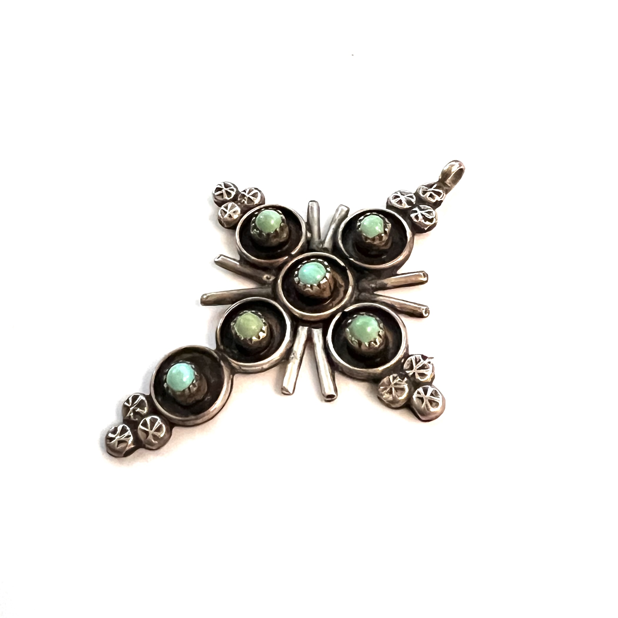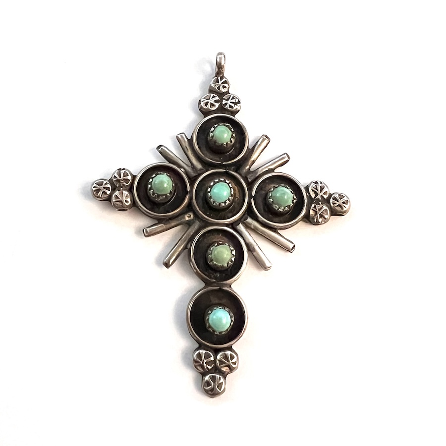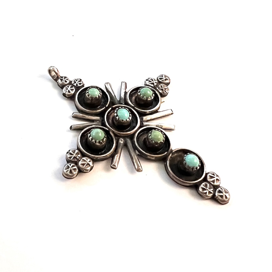 This is a large stunning Native American Zuni sterling silver and turquoise cabochon stones cross pendant. As is common with many Native American items it unmarked. It is also beautifully hand crafted and has been thoroughly jeweler tested and is Guaranteed solid sterling silver with natural turquoise gemstones…..not plated. Indicative of its fine quality workmanship all of the ends are hand tooled and the center rays are hand applied. Size measures 2.75″ tall north to south by 2″ wide east to west. Weight is 15.2 grams. The turquoise stones are natural and bezel set. Condition is excellent, gently used. It has a strong bail with a 4mm opening. Good for men or women just add a chain and you will have a gorgeous sterling silver and turquoise cross Native American statement necklace. It is highly noticeable with a strong oxidized finish around the stones.
