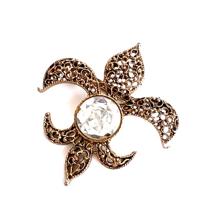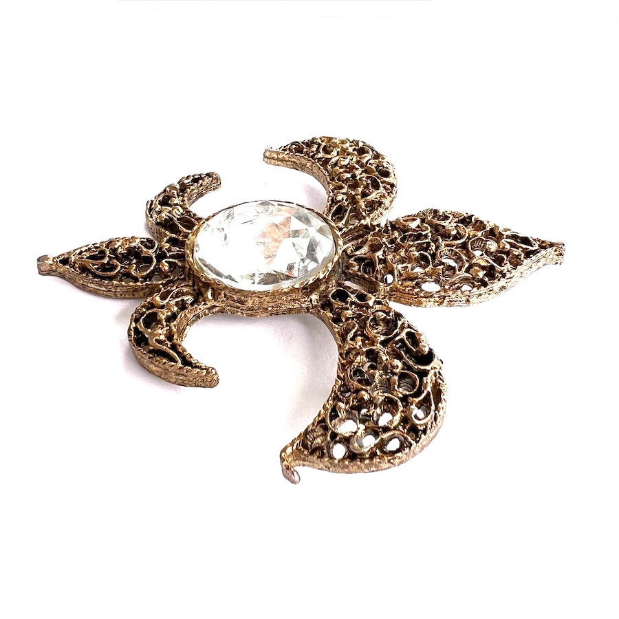 This is a beautiful large vintage 1970s fancy Fleur de Lis pin with a heavy gold plated antique gold finish in excellent overall condition condition. No damage or repair. All original. Never altered. It is thick and the filigree is strong, very well made. The finish is very much like you would see on old Goldette and Florenza jewelry from the same era. The center holds a very large 18mm, fully faceted clear crystal with a mirrored back and is still quite clean. The antiqued gold finish is excellent. No wear. Size is 2 11/16″ tall North to South by 2 3/8″ wide East to West. This is a beautiful showy example of 1970s Victorian Revival antique finish jewelry for your vintage statement jewelry collection.