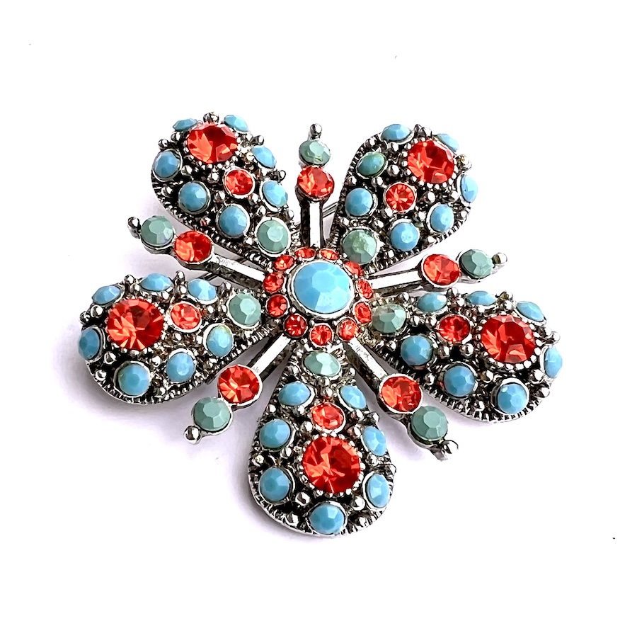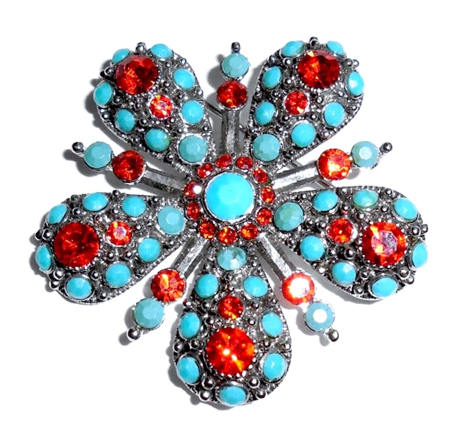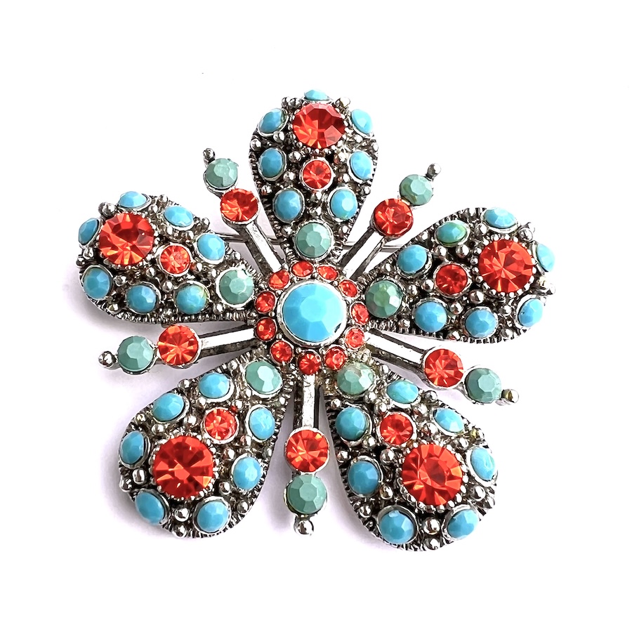 This is a very vivid 1960s mid century mod fashion jewelry flower pin. Beautifully made, thick and strong. Size is 2 7/8″ across any direction. The back is very, very heavily silverplated. The front has showy brilliant red rhinestones and faceted turquoise glass stones covering the flowers. Very pretty and showy. Looks good on any lapel. The 1960s flower power design is mixed well with somewhat of a sputnik look which was dominant in the 1950s to the 1960s. Overall condition is excellent. It came from an estate from many years ago. Doesn’t look like it was used much. Only one stone has small insignificant scuffs. No wear to the silver at all. No chips or flakes or damage to the rhinestones or glass turquoise. Beautiful look, good quality and great condition make it a strong addition for your vintage statement jewelry collection. If you like the woodstock flower power era then this is for you. Hard to believe this pin is unmarked by a known maker unless there is a mark under all of that heavy silver plate….