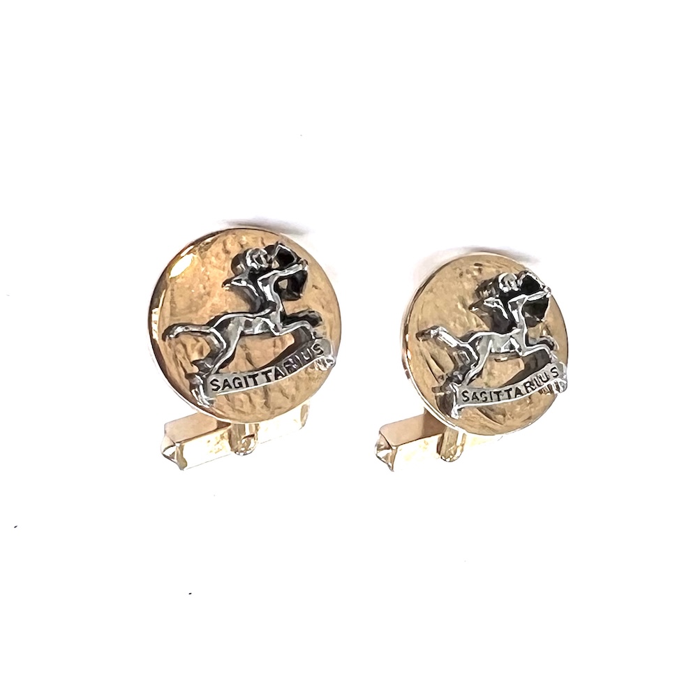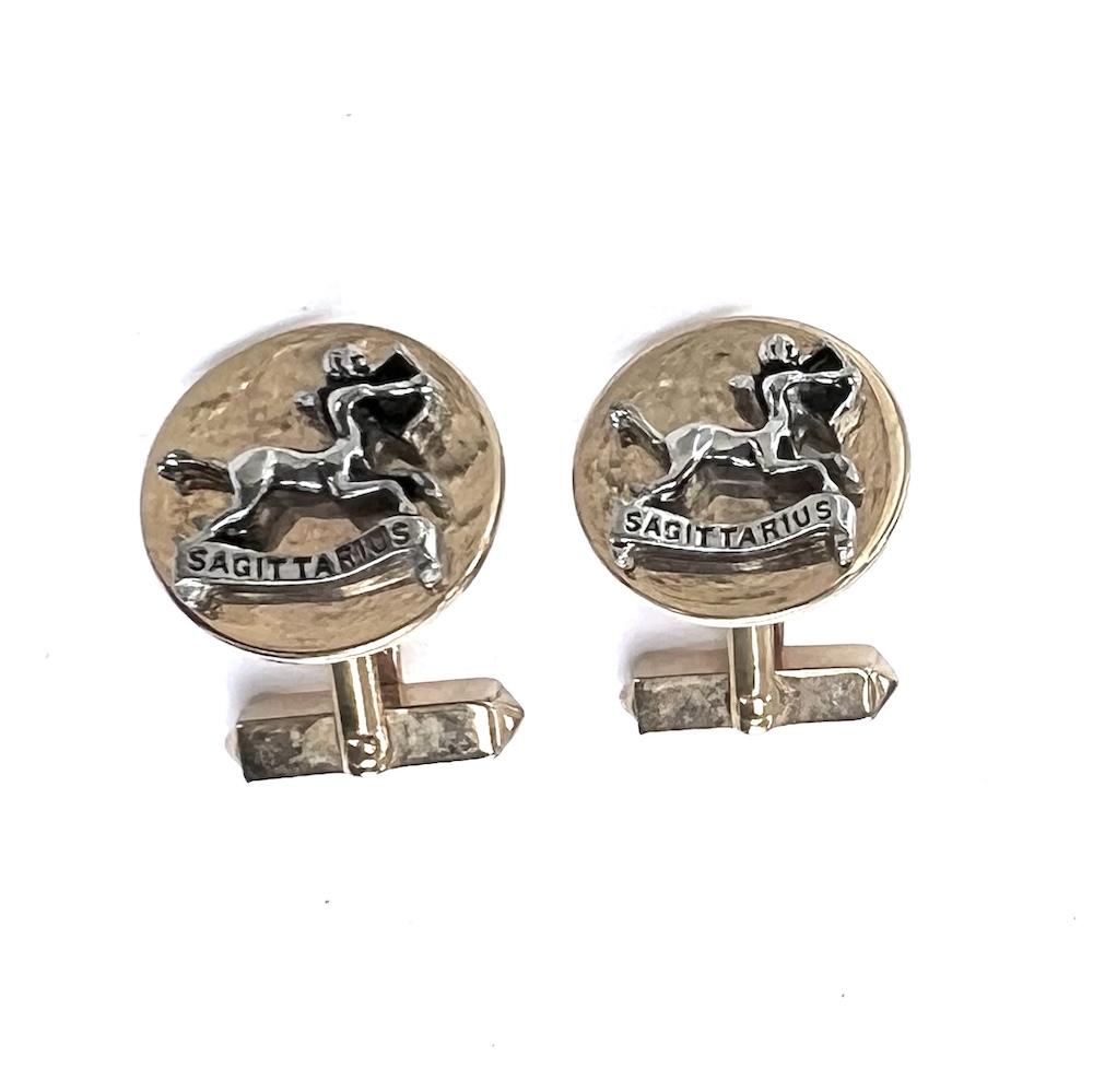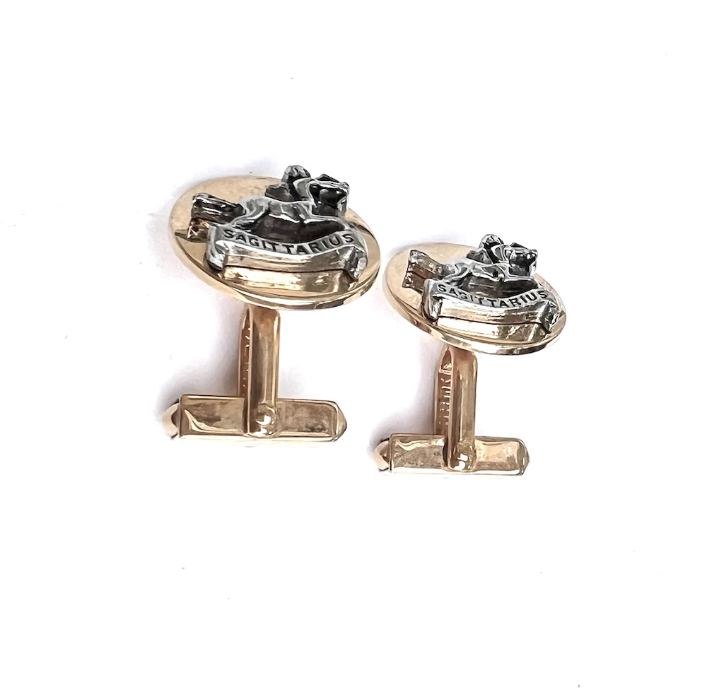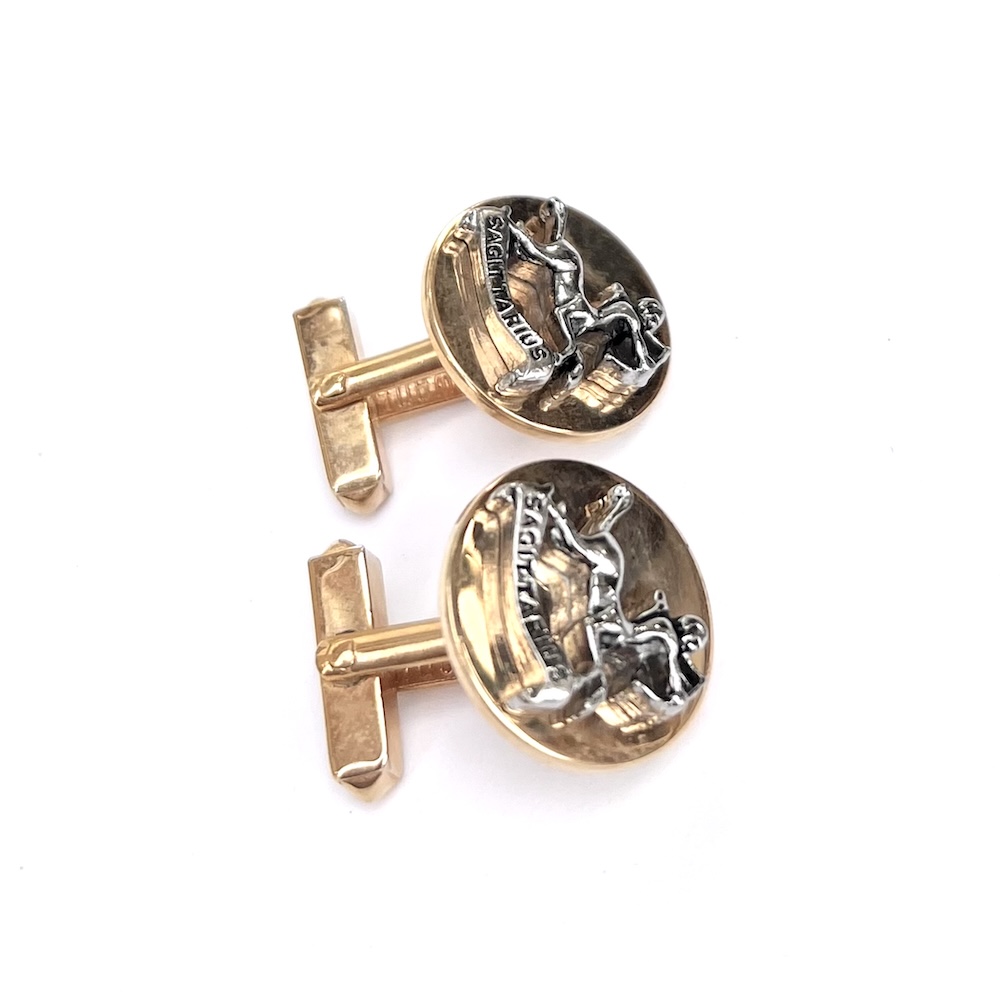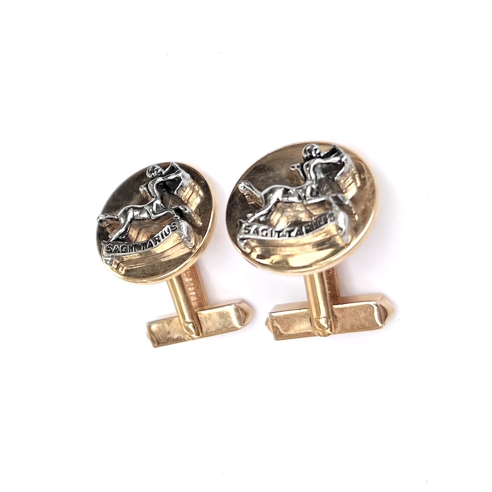 **These are so highly reflective that they almost look like liquid gold but are in excellent original condition…..Vintage pair of 1960s Swank gold plated/tone Swank swivel cufflinks with a two toned gold and silver raised Sagittarius figure. Highly detailed. Size of each top is 3/4″ across. They are in excellent overall condition having only minor wear to the back of one link. No damage or repair. Lovely 1960’s cufflinks for your collection or for gifting someone whose sign is Sagittarius.