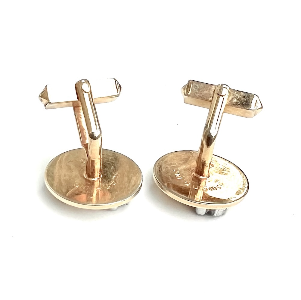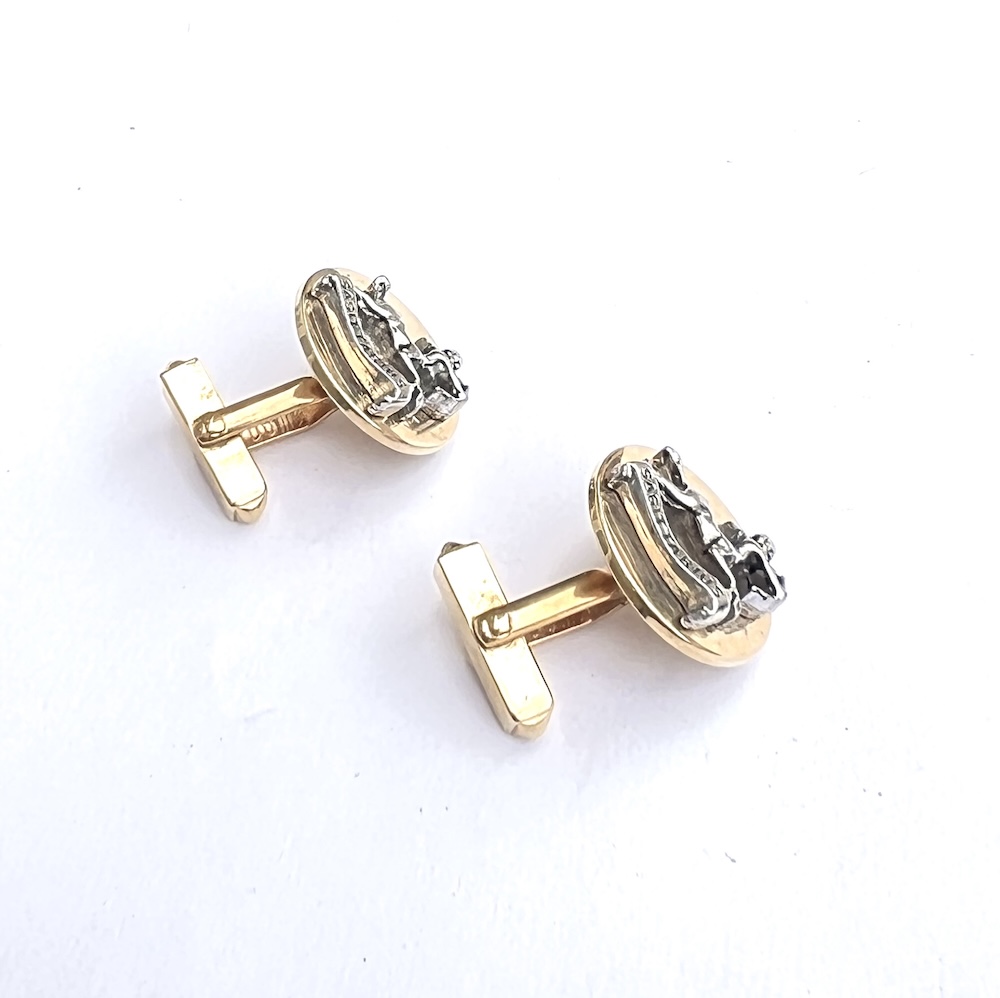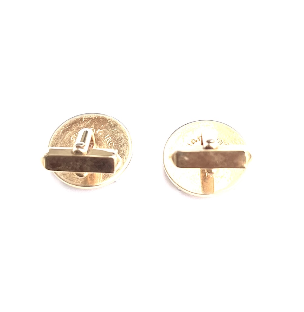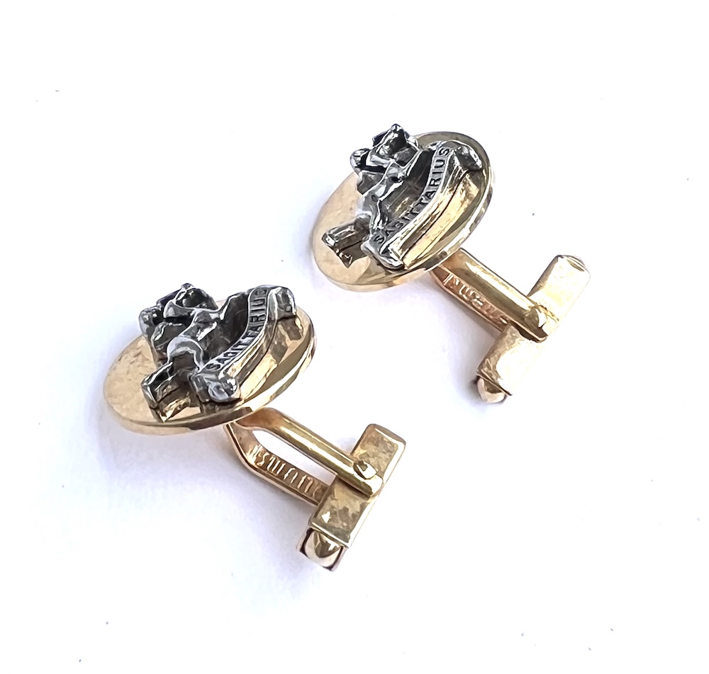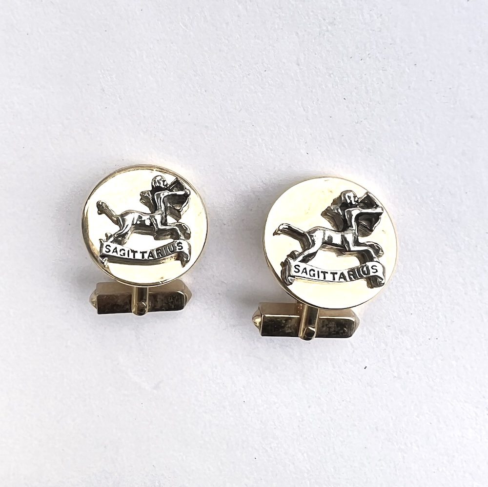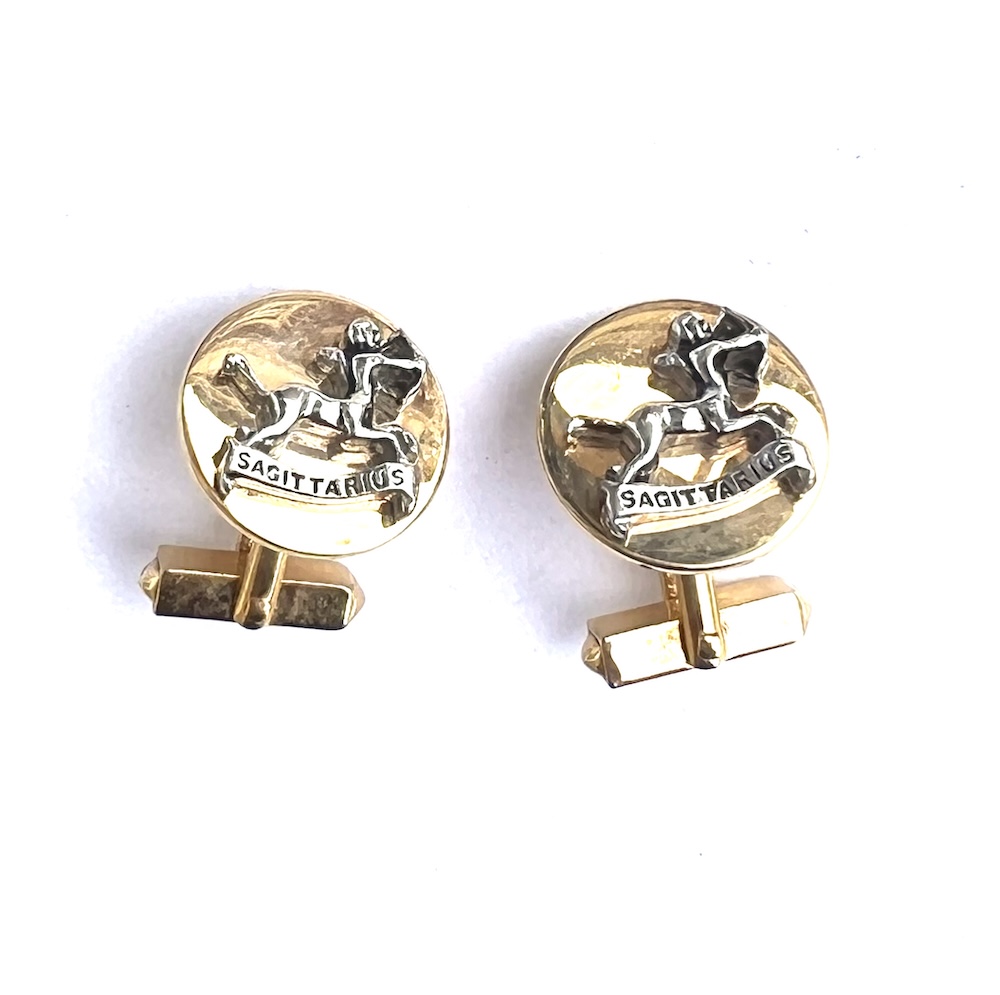 **These are so highly reflective that they almost look like liquid gold but are in excellent original condition…..Vintage pair of 1960s Swank gold plated/tone Swank swivel cufflinks with a two toned gold and silver raised Sagittarius figure. Highly detailed. Size of each top is 3/4″ across. They are in excellent overall condition having only minor wear to the back of one link. No damage or repair. Lovely 1960’s cufflinks for your collection or for gifting someone whose sign is Sagittarius.