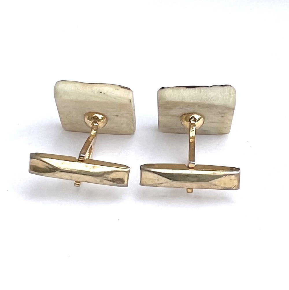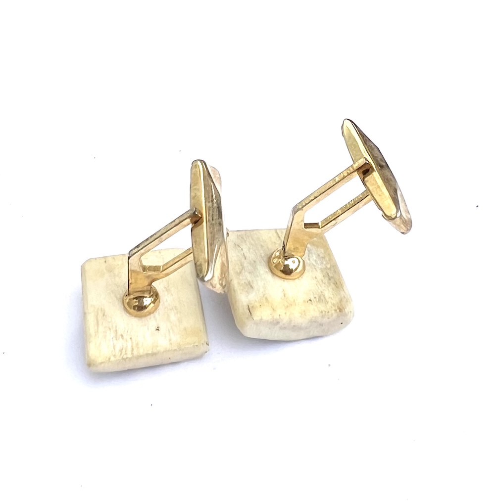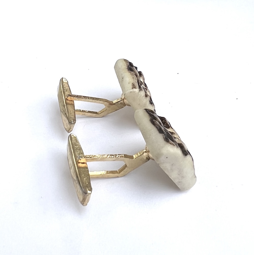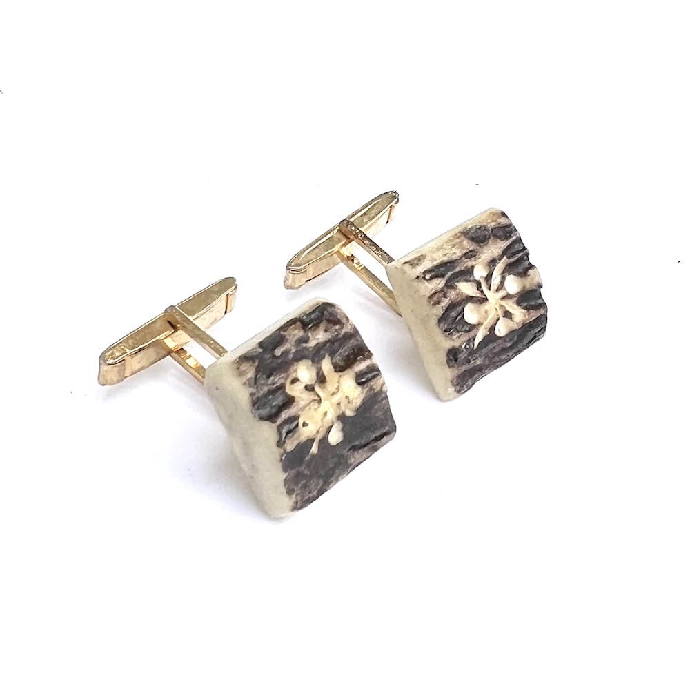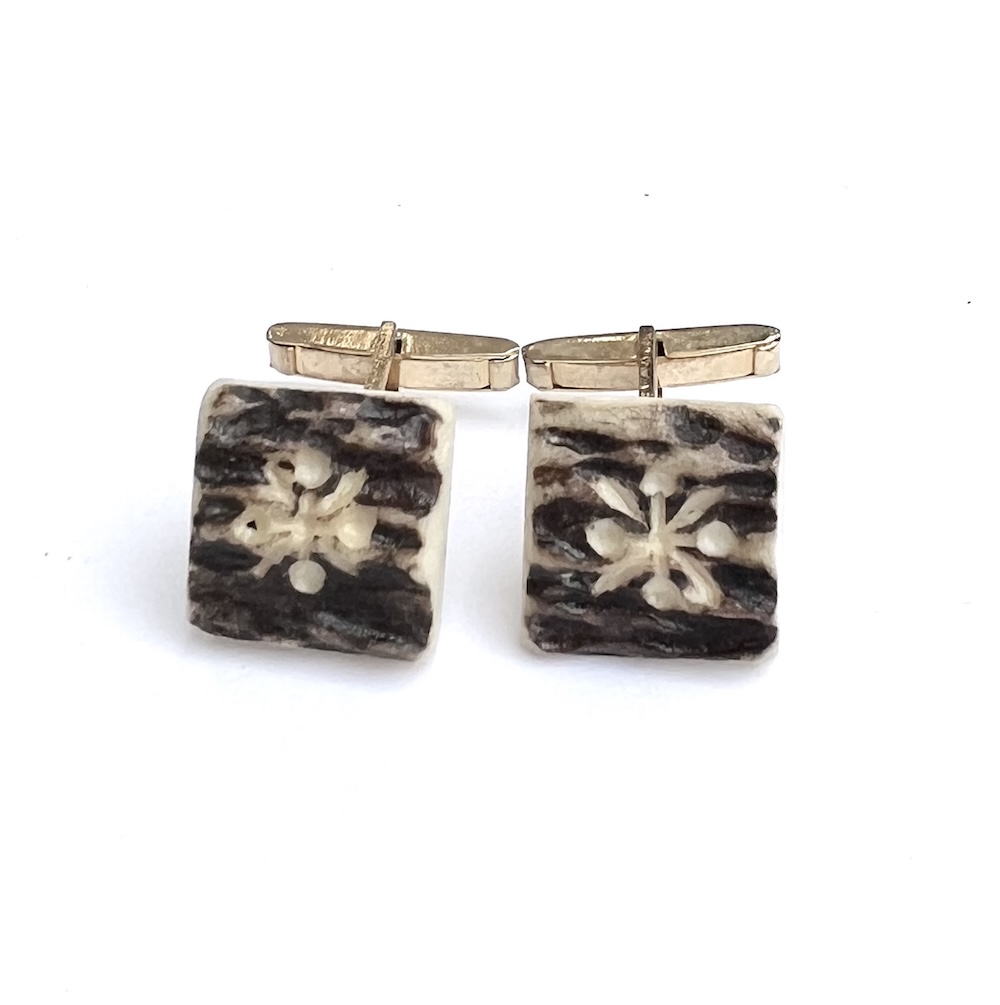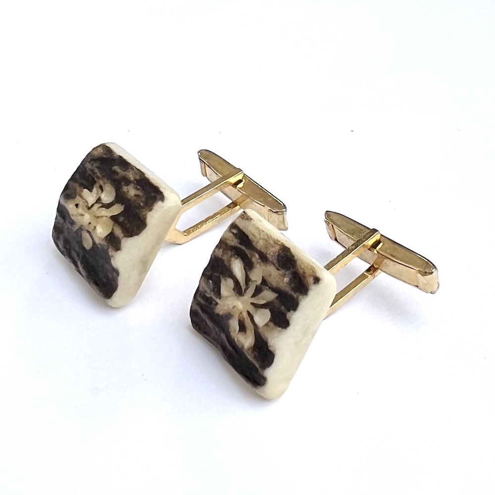 From an estate this is a pair of 1940s, 1950s Art Deco gold plated swivel cufflinks with large hand carved natural slab tops that have been hand dyed/colored brown. Needle tested and guaranteed to be bovine bone or some other natural material…….not plastic or resin. They are hand carved and deeply recessed with each having a very noticeable symbol or flower on top. Being hand cut and natural one is slightly thicker than the other. The tops are approximately 5/8″ square. This is a most unusual pair of vintage hand carved bone statement cufflinks for your collection. Excellent condition overall. No damage or repair. No wear to the heavy gold plating in the back that is all still bright and shiny.