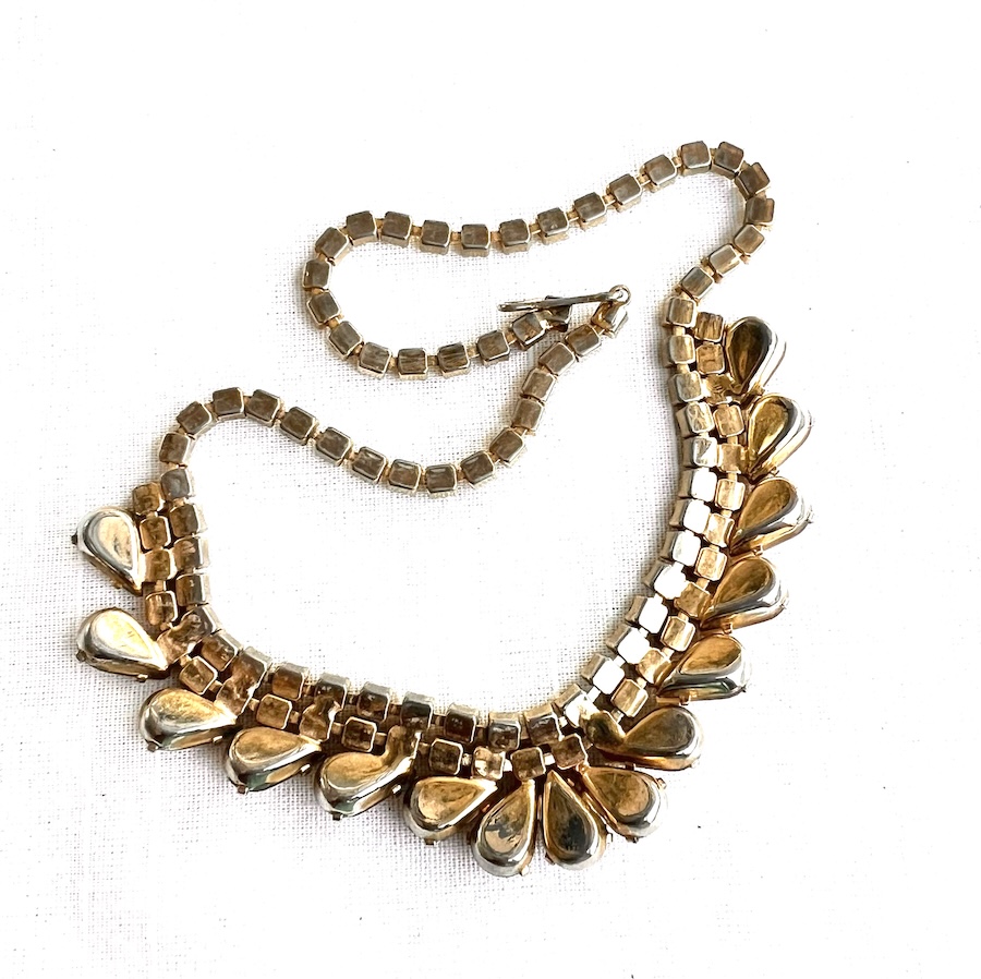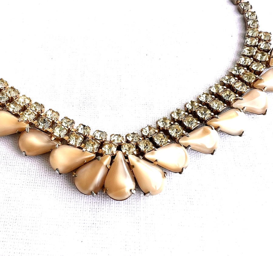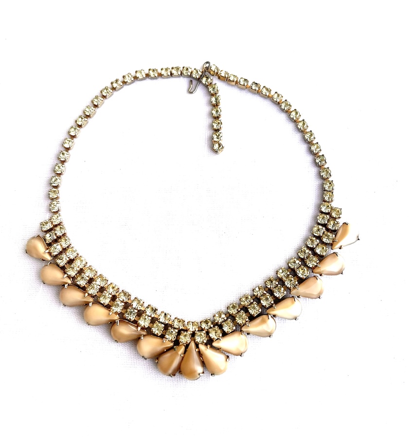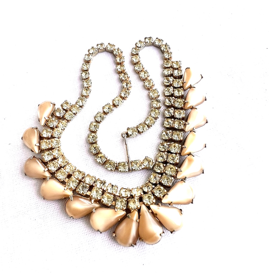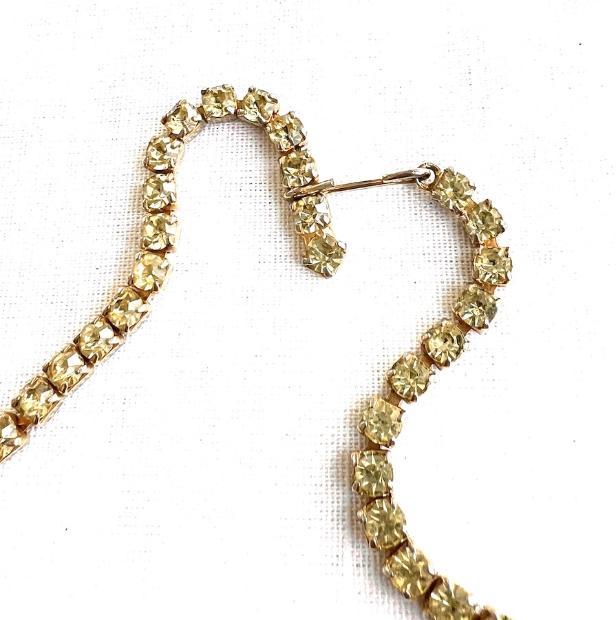 This is a beautiful unusual vintage bib necklace made of bright lemon lime (pale canary yellow with green flashing) crisp clean rhinestones surrounded by molded opalescent glass fancy pear shaped stones around the bottom. Size is 15 3/4″ long end to end by 13/16″ across the centerpiece. All of the stones are still bright, crisp, clear and clean. Overall condition is excellent. It sat in a draw in an estate untouched for many decades where it was kept in fine condition. No damage or repair. Never altered or modified. Having attractive pale lemon green rhinestones unusually mixed with beige to white opalescent glass makes this a lovely statement necklace for your vintage jewelry collection.