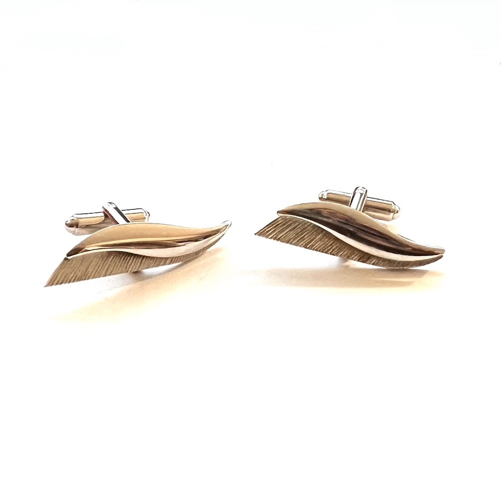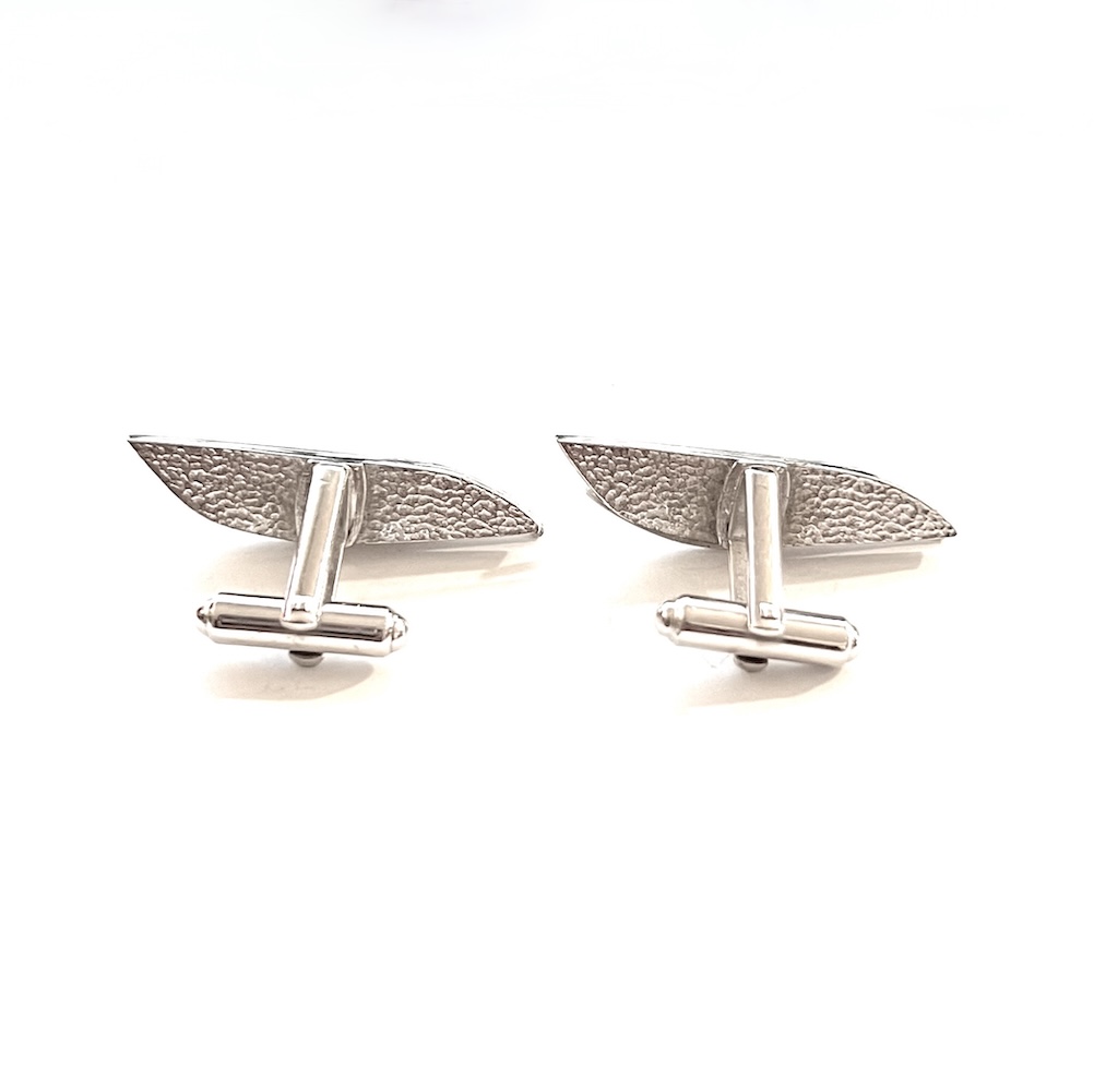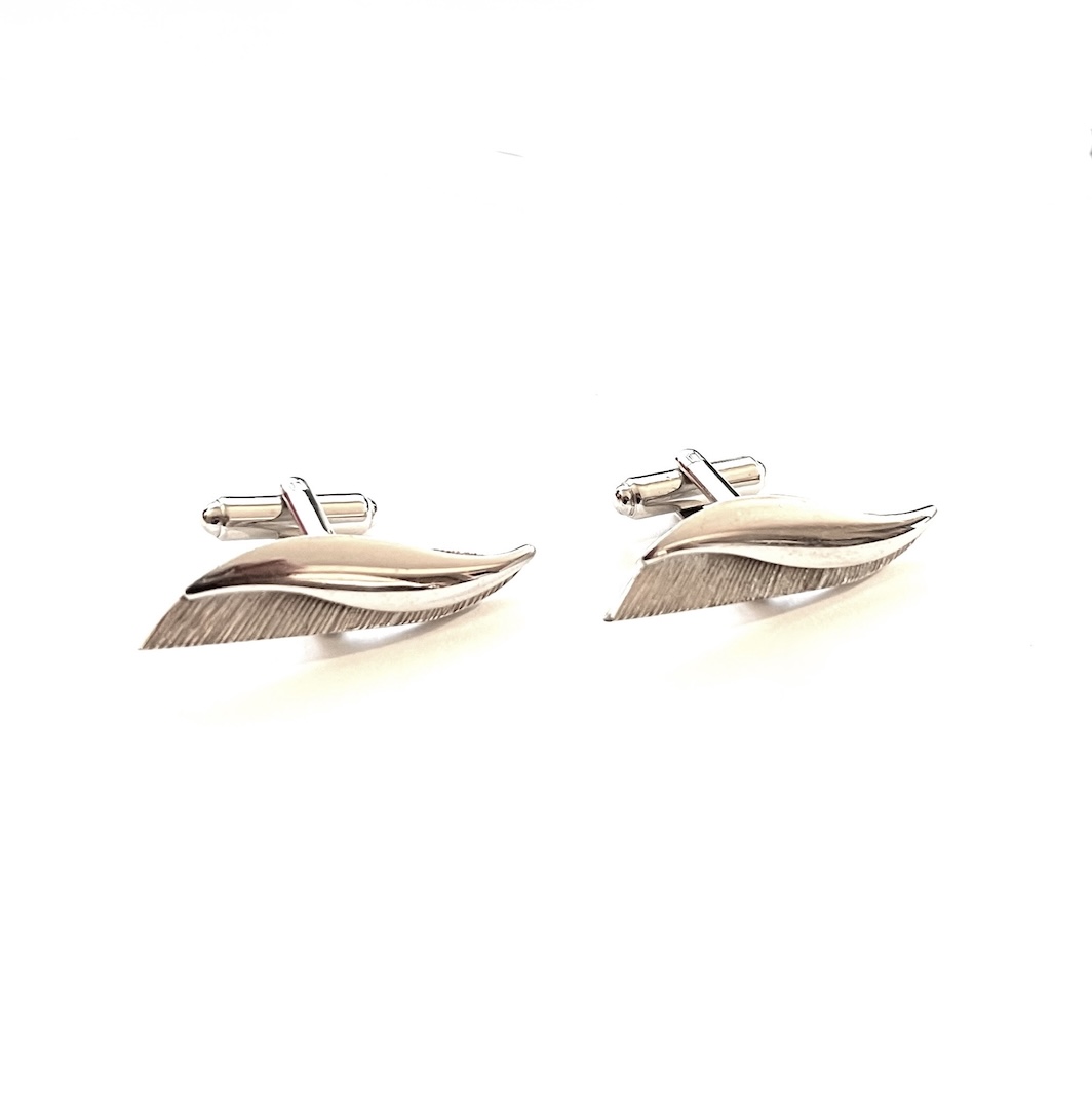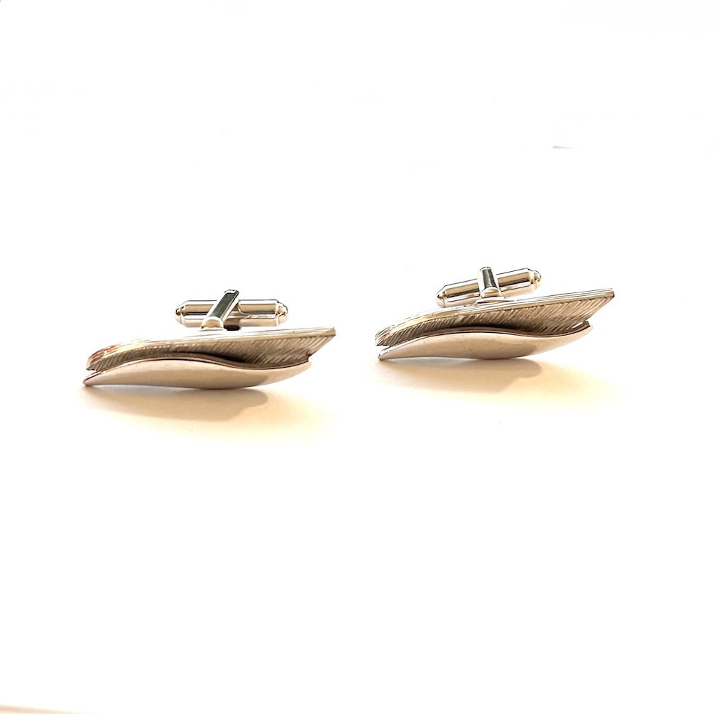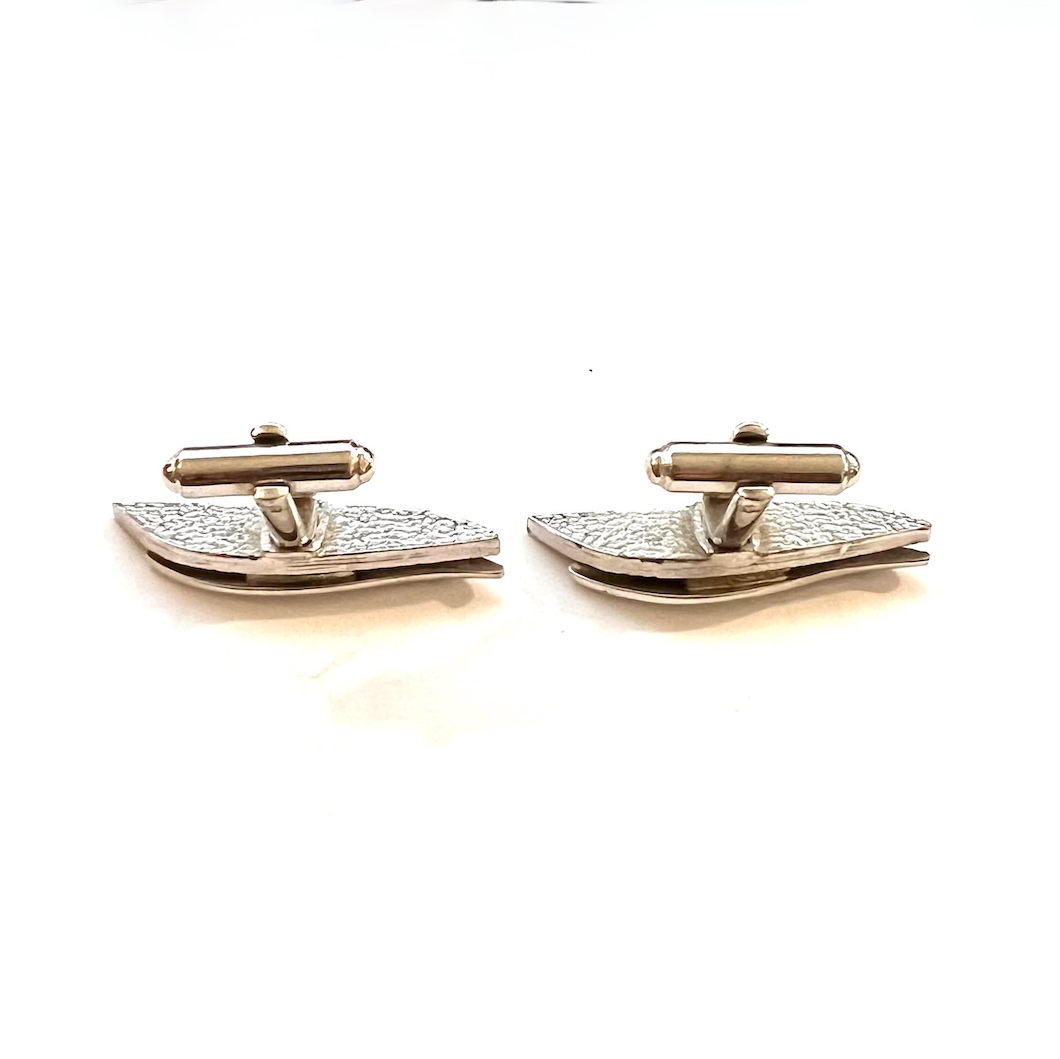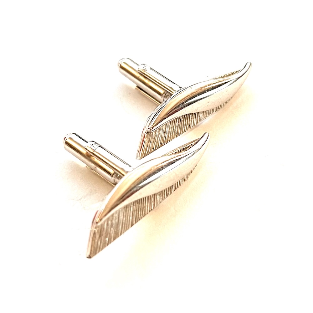 In excellent overall condition this is a pair of vintage mid century modernist abstract stylized swivel cufflinks. They are very elongated and the tops measure 1 3/8″ by 3/8″. The backs have swivel links with a hammered textured design. They were never monogrammed or inscribed and have a nice, showy modernist abstract design. Still retaining all of their original bright shiny finish to the silver this is a lovely pair of cufflinks for your mid century jewelry and cufflinks collection.