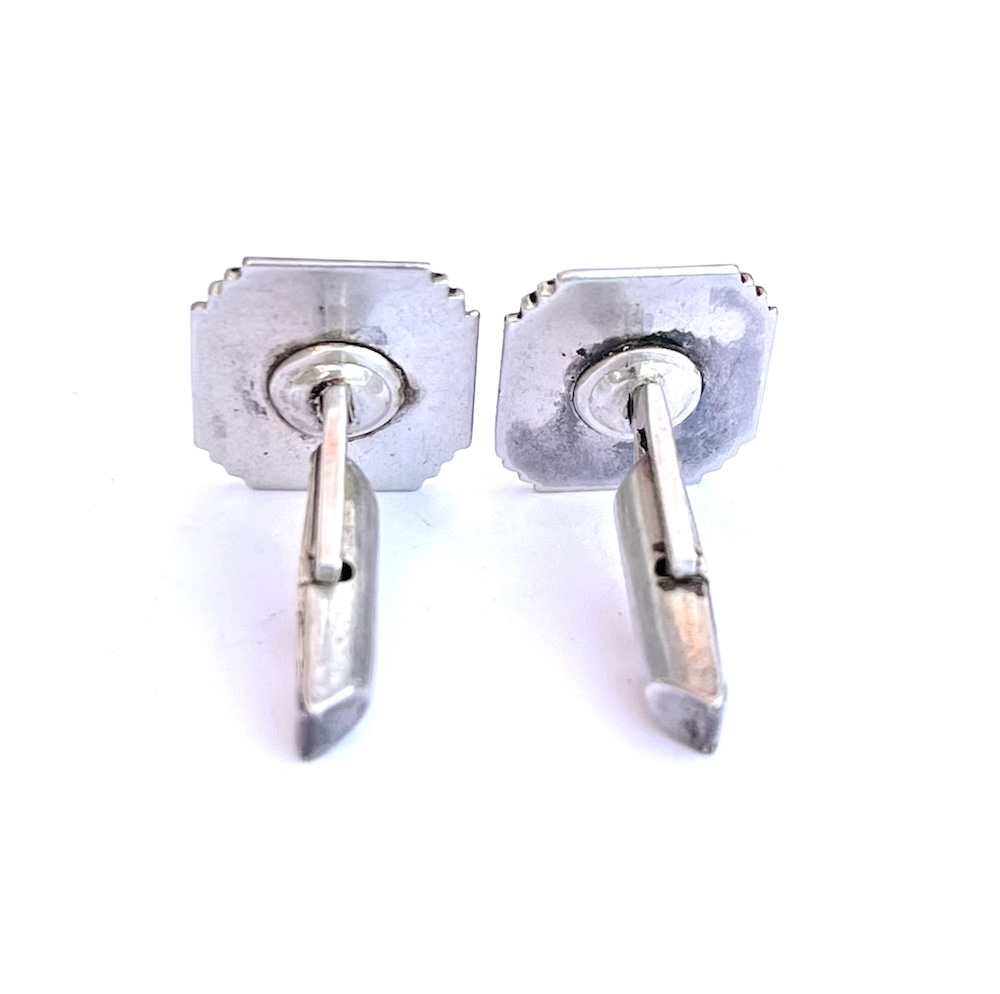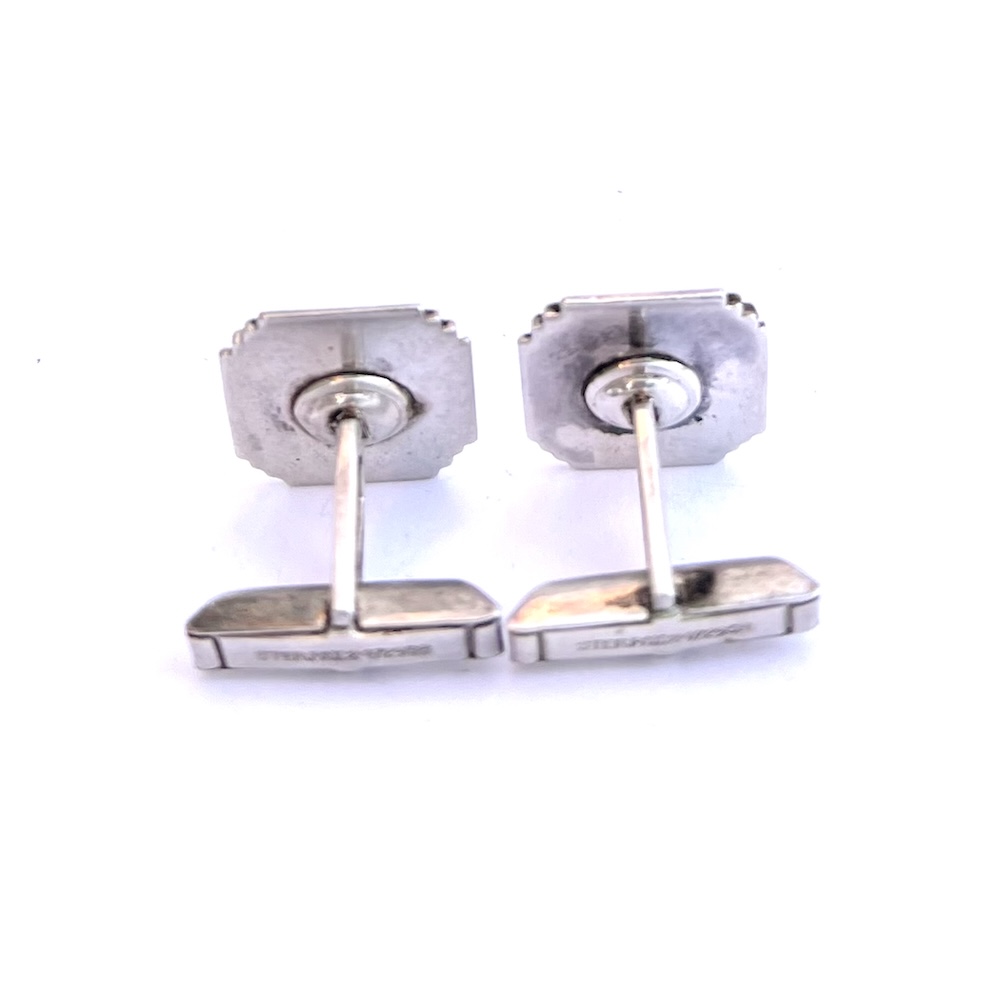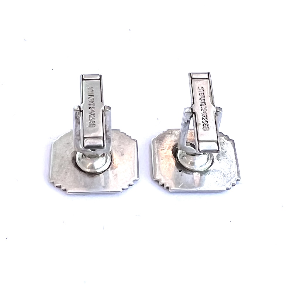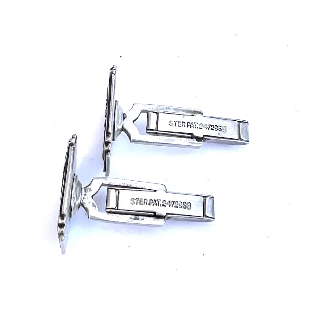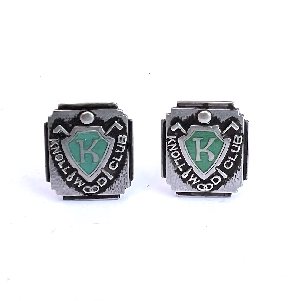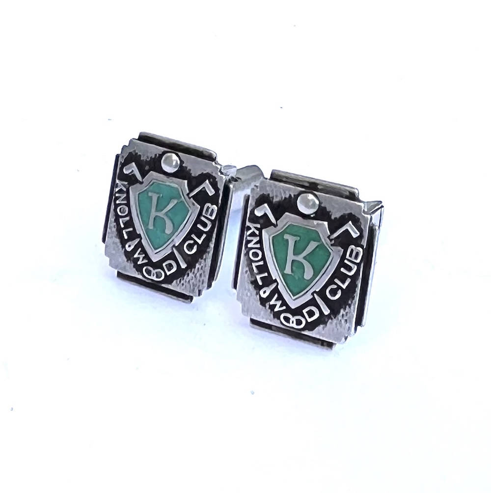 This is a pair of vintage late Art Deco to early Mid Century sterling silver Knollwood Gold Club enameled mens cufflinks from Chicago with a 1949 Patent Date. They are marked sterling and Guaranteed to be solid sterling silver. They are also marked PAT: 2472958. This pair has an Art Deco stepped design in the silver on the front along with green enameled K in shield cartouches and swivel backs. They are hand enameled and one has a very slightly deeper shade of green than the other. Size of tops is 11/16″ north to south by 9/16″ wide across the center east to west. Weight is 11.3 grams. Condition is excellent, very gently used. All enamel work intact. No worn enamel. All sterling silver is still thick and solid. Not worn down. No dents or dings. No repair or alteration of any kind. Completely original estate item. Not freshly polished. Light age wear in the back. Very well made with thick sterling silver and strong swivels that work with with ease. Never monogrammed or inscribed. This is a lovely vintage estate find for anyone who collects golfing memorabilia or antique and vintage cufflinks.