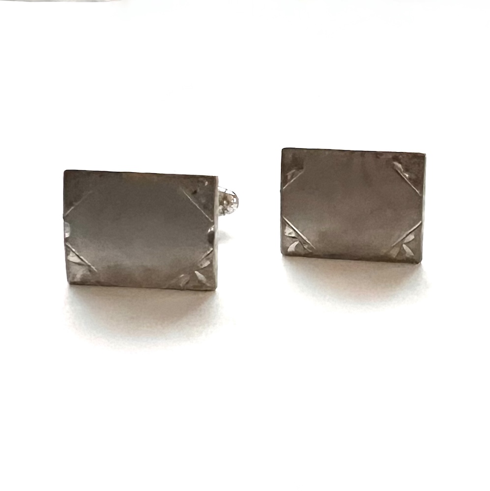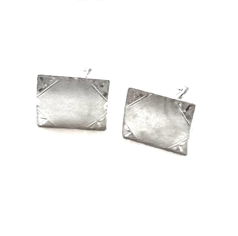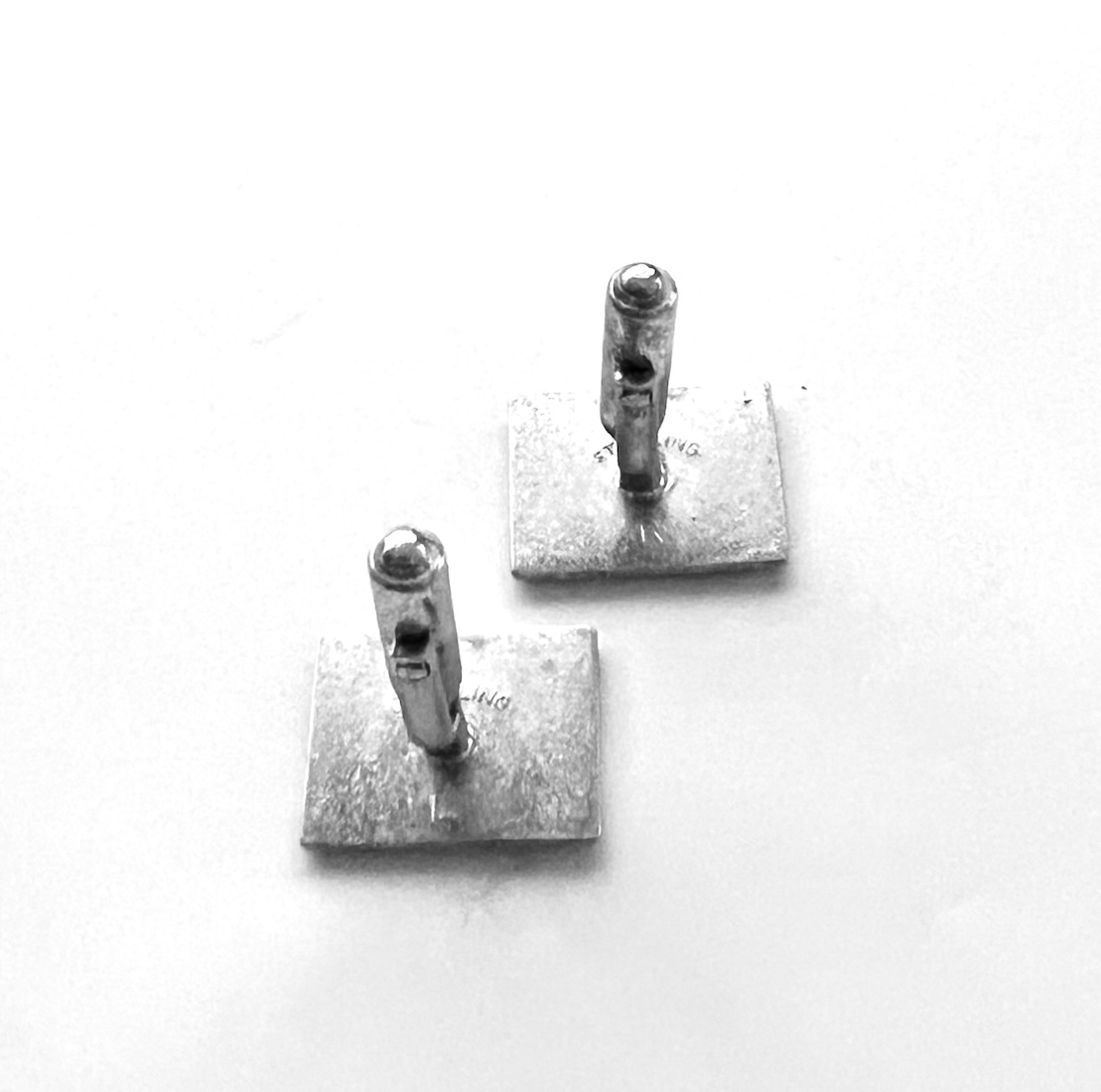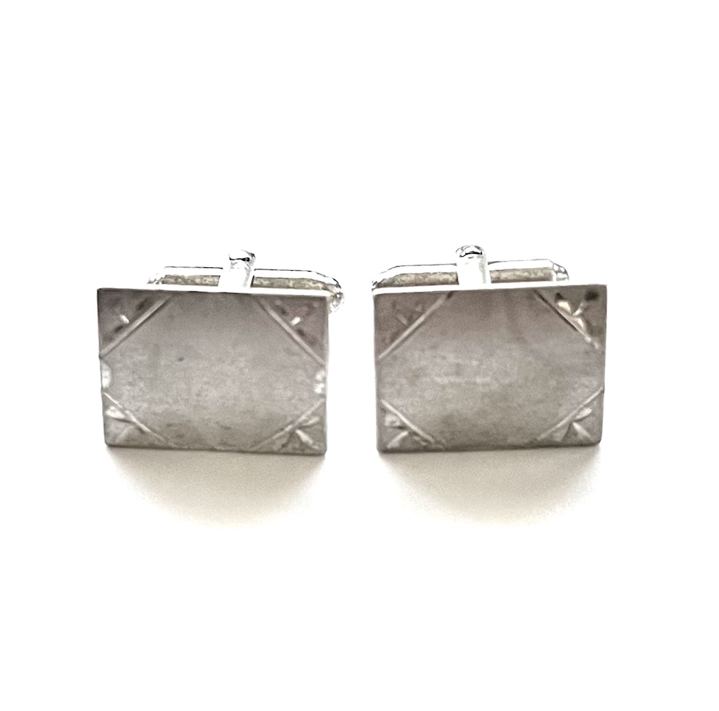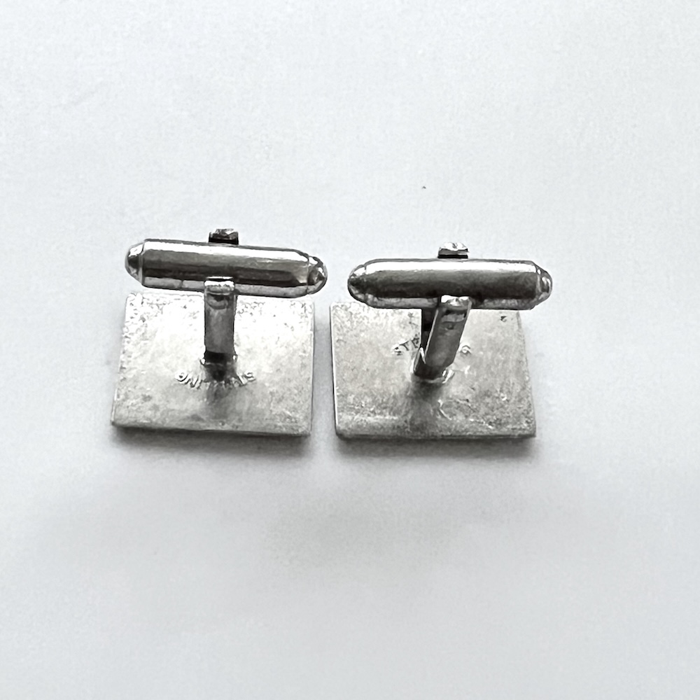 Pair of vintage mid century 1960s sterling silver men’s swivel cufflinks with a brushed Florentined finish in excellent condition. Marked Sterling R on one line and sterling L on the other. From an estate and in excellent condition only having a few tiny minor age scuffs. Not at all eye obvious when the links are worn on the wrist. No dents or tears or repair. The tops are 3/4″ across East to West by 9/16″ North to South. Never monogrammed or inscribed. A classic pair of vintage sterling silver statement cufflinks for your collection.
