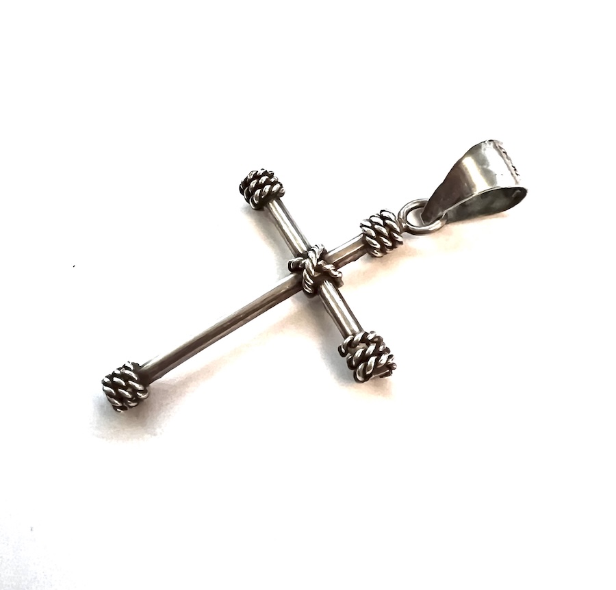 Vintage Taxco Mexican Sterling Silver Cross Pendant Religious Christian Catholic – This is a vintage 1970s to 1980s Taxco, Mexico sterling silver mens or womens cross pendant in excellent condition. Marked 925 Mexico, TM-247 with the T to indicate Taxco origin, M being the maker and 925 to indicate sterling silver quality. Like most items made of Mexican sterling silver this cross is thick, strong, and very well made. No damage or repair. Size is 2 1/4″ tall North to South from the top of the bail to the bottom of the cross. The bail is able to hold a thick chain easily up to 5mm as it has a 7mm opening. This is a lovely cross pendant for your vintage statement jewelry collection. The twisted silver wrap is hand applied and quite noticeable like 1970s mid century Brutalist design.